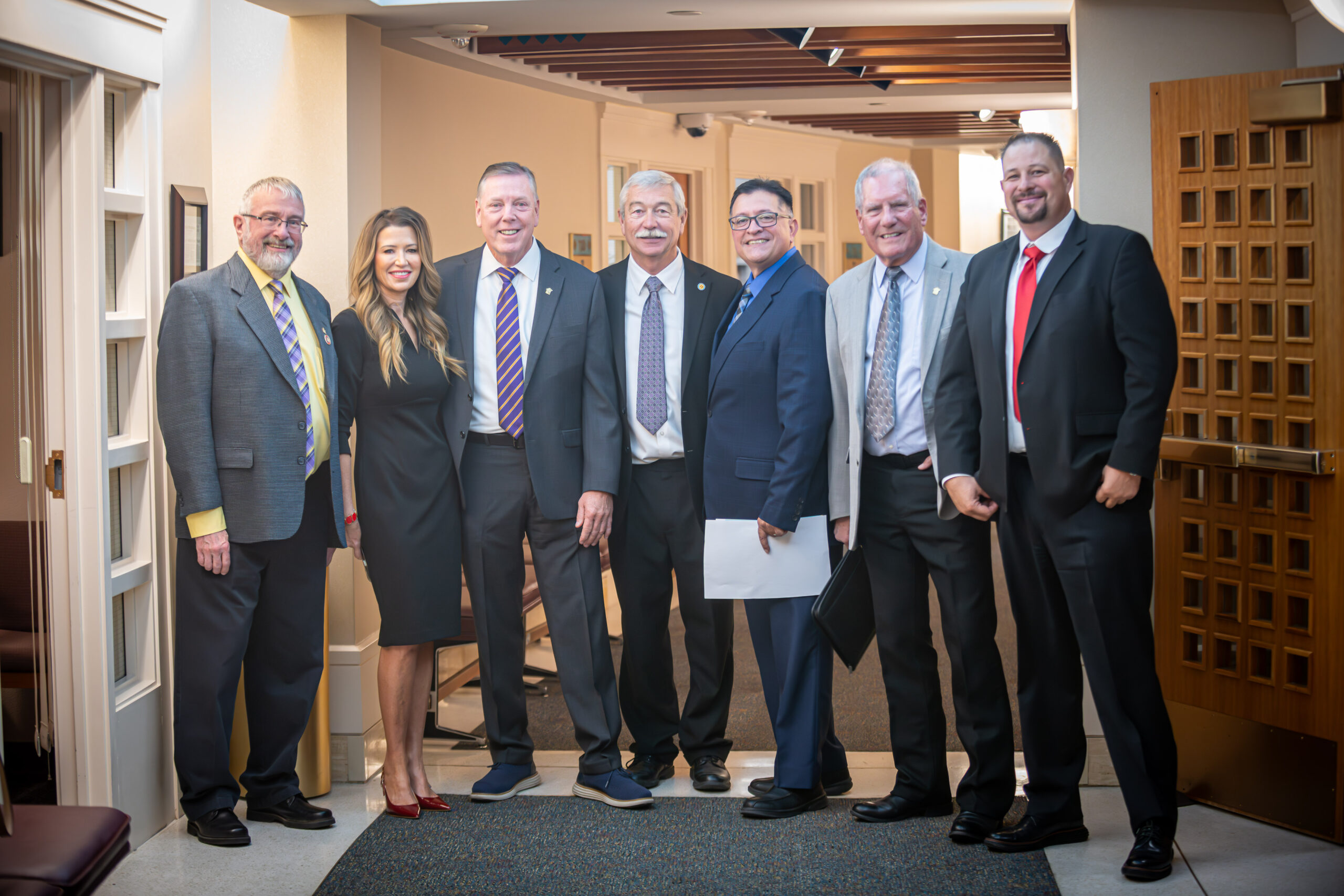 Cutline: Western New Mexico University Interim President Christopher Maples, PhD; Sen. Crystal Brantley; J. Dean Reed, secretary/treasurer of the WNMU Board of Regents; Sen. Steve Lanier; Sen. Gabriel Ramos; Steve Neville, chair of the WNMU Board of Regents; and Sen. Joshua Sanchez.